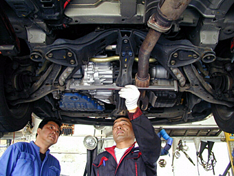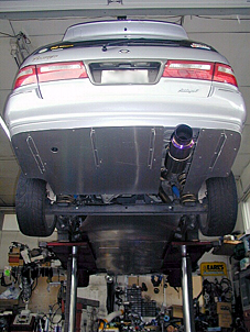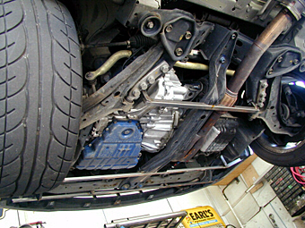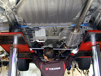 8.フロント架台(完成) フロント部分のディフューザーを装着する架台の 完成状態です。フロントのシャーシ部分に1箇所、 ATオイルパン前に1箇所、そしてフロントメンバー のところに1箇所の合計3箇所になります。 一番手前のシャーシ部分の架台はエンジン始動や 変速時にエンジンが動いて蛇腹の箇所が干渉をして しまう為、当たらないようにカットがされています。 |