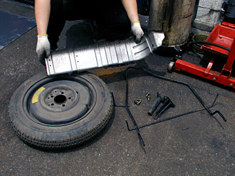 3.応急タイヤ&燃料タンクカバー こちらも今回、撤去&廃棄となった床下の収納物とパーツ。 応急タイヤは16インチですが、Myプレのフロントには 入らないので、積んでいても無意味の為、これを機に廃棄。 (この応急タイヤ、ものすごく重いです) プレート状のものは燃料タンクの前についている飛び石 防御用のカバーです。ディフューザーで燃料タンクごと 覆うことになるため、付けていても邪魔になるだけで 意味がないのと、少しでも軽量化する為に撤去しました。 |