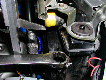 ロングストレートめがねを使っておよその位置を確認。 位置ですがめがねの下、つまりエンジンヘッドと水平の 高さが右にあるラジエータ押さえと丁度同じになります。 これがどのぐらい下の位置にくるか? 30oぐらい下がると、最も車の中で重いパーツで あるだけに挙動や旋回能力も含めてかなり違いが 出るハズです。 |