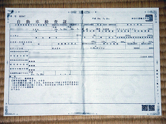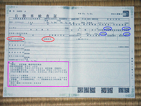 昨年にエンジン換装を行って1年が経過。換装後初の車検を迎えました。 エンジン=原動機は車検証に型式登録されている為、エンジン本体が変わってしまった 現状では車検を通過しません。車検と同時に構造変更の申請を行い、正式に変更認可の 下りた車両、いわゆる「公認」を取得しなければなりませんので、申請を行うことに なりました。 残念ながら車検場で構造変更申請に立ち会うことはできませんでしたが無事認可が下り、 公認取得することができました。 構造変更申請をすること自体が珍しい行為であると思いますので、書類上になりますが 申請前と申請後を比較し、纏めてみました。 車検証(KA24) ![]() U30前期の車検証です。搭載原動機はお馴染みのKA24です。 この時点でかなり普通のプレサージュと違う点がいくつも私のプレにはありましたが、 念のため突起物と見なされる可能性からディフューザーを外して出していた以外は そのままで車検に出しており、このようにきちんと車検証が発行されています。 この時点で車検の際にチェックされていたと思われる項目は ・ディフューザー → 念の為外して申請。そのまま出すとNGだったかは不明 ・チタンマフラー → 排気ガス、音量共に基準値以内 ○ ・ロールケージ → ダッシュ貫通でない為、構造変更不要 ○ ・ローダウン → 最も低い所で10センチ程度のクリアランス有り ○ ・オーバーフェンダー → ギリギリOK。某量販店はNGでしたが・・・ ○ ・ブレーキ → 逆に止まる方向への強化なので全く問題無し ○ ・バッテリー移設 → 取付け位置がマフラーのサブサイレンサーより上 ○ ・シーケンシャル点火 → 点火方式の変更で、原動機自体は変更無し ○ ・ヘッドライトHID化 → HI−LOW切替えを4灯点灯式に変更 ○ この辺りだったと思われますが、前述通りディフューザーを念のため外していた 以外はそのままで普通にDR経由の車検で通過しております。 今回は原動機の型式が変わり原動機の項目だけでなく、排気ガスや車本体の重さも 基準が変わってチェックの対象となりますので、何がどうなっているか判っている 店でなければ申請書類自体が作れない為、ショップ経由で車検と構造変更の申請を 出しております。 車検証(SR20) ![]() 無事申請を通過して発行された車検証です。以前と変わった項目は大きく3ヶ所です。 まずは型式。U30前期の車両型式はGF−U30ですが、構造変更した車両ですので、 U30の後ろに<改>の文字が入り、GF−U30改となっています。 原動機の型式もKA24 → SR20に変わっています。KA24はKA24DE、 SR20ターボはSR20DETとメーカーのカタログなどで表記されていますが、 車検証の原動機型式はあくまでエンジンの型式表記なので、NAでもターボでも一律、 同じ型式表記となります。 2つ目はエンジンの型式変更に伴い車両重量が再計測となっています。 ロールケージなどで重さが増えたものがあるとは言え、逆にエンジンやマフラーなど 純正より大幅に軽くなったものもあるので、新車とトントンと見ておりましたが、 車内の下ろせるものは全て下ろしたにも関わらず、100kgの重量増となっています。 これは新車登録の際の重量はメーカーが机上でパーツの重量を計算して出した値を 運輸局に申請している為(プレサージュと言う車を登録しなければなりませんので)、 いわゆる理論値が通常の車検証には記載された状態で、、実際にはプレサージュクラスの 大きさになると新車でも実測すると100kgぐらい平気で誤差が出るそうです。 車はオーナーが手を入れていくと重くなる傾向にありますから、100kg増にしか ならないのはかなり優秀だそうで、きっちり軽量化もしないと出ない値とのことでした。 実質はすっぴんの新車とトントンと言った所でしょう。 3箇所目は構造変更申請に伴って備考欄の記載項目が大幅に増えています。 変更申請を行う前の状態がどんな状態で、どういった内容の変更項目をどのような検査を 行ったかなどが記載されています。[]で括られた項目がどうやら右下のQRコードでも 見ることができるようになっているようで、括弧の数とQRコードの数が同じ7つです。 登録事項通知書 ![]() 申請した登録事項と相違が無いか確認する為の通知書です。 今回の変更登録申請の主たる理由は「エンジン型式変更に伴う申請」ですから、 車両の型式と原動機の型式の部分が通知書に掲載されています。 車両重量の部分はエンジン型式変更に伴い、再計測が必要となった為、その実測値が 車検証に記載されたと言う二次的な要因ですから、主たる登録事項はこの2つです。 この書類も構造変更申請を行わないとお目にかかれない珍しい書類の一つでしょう。 まとめ 申請でかかった総費用ですが、車検の際に納付する重量税等も含めて約30万円でした。 普通に申請しても15万円前後かかったように思いますので、約2倍の費用がかかった 事になりますが、ディフューザーを装着した状態で正式に認可が下りましたので、 車検に出す際は本当にそ