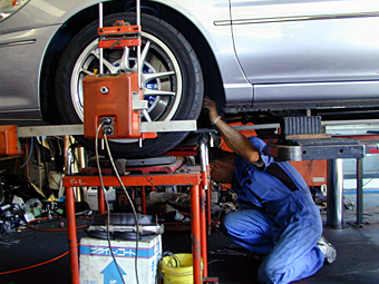 延び延びになっていたアライメントの計測を行いました。 4輪にこのような計測器具を取り付けて計測を行います。 計測方法は他にタイヤの外側に装着して行うタイプや、 ホイールの内側に装着するタイプ、中には計測器の上を 走らせただけで計測できるタイプ(機械のお値段が驚きの 2千万円もするそうですが)などがあります。 中身はセンサーや精密器具の塊で、落として壊してしまうと 修理に60万円もかかるんだとか。 |