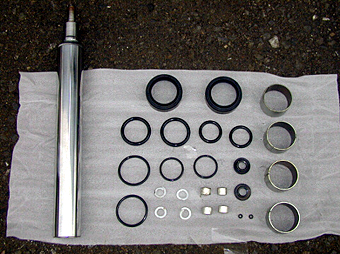 オーリンズではオーバーホールを行うとどのパーツを 交換したのか、証拠として全て同梱して送ってきます。 写真はフロントショックの交換パーツ一式。 左側のシャフトですが表面上は何ともありませんが、 内側は焼けてしまっていました。真ん中のゴムのリングも 潰れてしまっているものや、切れてしまっているものが いくつかありました。右側のアルミ製のリングと真ん中 下段のリングも表面が焼けてしまっています。 |