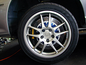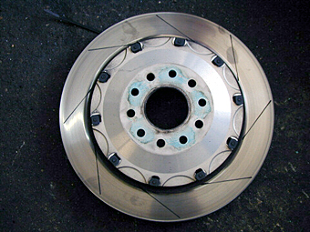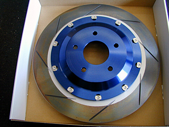 新しいローターを組んだ状態です。 ベルハウジングの青い塗装がちょっと目立ちます。 ローターとハウジングの間に白い部分がありますが、 この部分はパッドが当たらない為、時間と共にここだけ 錆びが発生して汚らしくなってしまいます。 APより若干ベルハウジングの径が小さい分をカバーする 意味で施された処置だと思われます。 |
