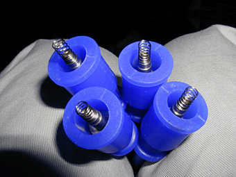 プラグコードの端子部分拡大写真です。 通常はディストリビュータにはめ込むような端子が 使われておりますが、この端子はコイルに直接差す為、 特殊な形状をしています。滅多に使わない端子の為、 端子がメーカーで弾切れになっていて通常、 2・3日で出来上がる所、4日程度を要しました。 |