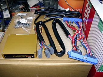 フルコンの王様、HKSのF−CON V−Proです。 ご存知の通り、あらゆるきめ細かいコンピュータの設定に 対応した最強のフルコンで、これが1基あれば車の設定の ほぼ全てに対応ができます。ショップが設定を行うには HKSのV−Proチューナー専用の難易度の高いテスト に合格しないとできないようになっており、資格を持って いないと扱えません。またプレでの前例が無いとのことで、 メーカーに各種セッティングを調査してもらい、 本来ならシルビア用として使われるケーブル(右側の青い カプラがついた線)をプレ用に加工して使用しました。 |