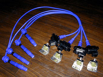 プラグコード+コイル+イグナイターの点火系一式です。 写真のようにプラグコード1本につき、このような形で コイルとイグナイター(コイルとイグナイターは別途、 線で繋げます)が一式になります。 今回のシーケンシャル点火方式ではV−Proにより、 これら4本を独立して制御します。 |