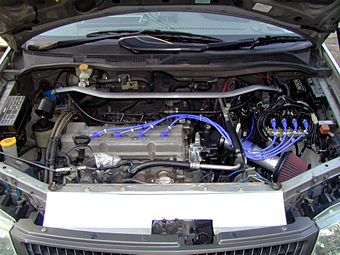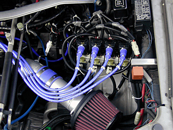 角度を変えて撮影したメカニズムの写真です。 将来的にはエアフロも使えなくなるので、エアフロも これを機に潔く取っ払いました。ディストリビュータの プラグコード用の穴はシリコンで塞いであります。 通常の車はこのディストリビュータで点火や昇圧と言った 全ての点火に関する作業を行うわけですが、構造が単純化 できてコストも押さえられる優れたメリットを持った一方で、 4気筒なら4気筒分、6気筒なら6気筒分の負荷がここに 集中する為、熱を持ちやすく、効率の面でロスを生じたり、 より強力な電圧を長時間かけたくても限界が低いなどの 弱点もあります。(パソコンのメモリーが512MB×1 よりも256MB×2の方が処理速度や効率が高いのと 理屈はほぼ同じと考えて頂ければと思います。) そこでレースの車両ではコンピュータにより4気筒なら 4気筒分を全て独立させて制御し、負荷分散を図ると同時に 点火効率を飛躍的に高めるシーケンシャル点火方式を使って いるわけです。実際に走ってみて確実にパワー・トルクとも 以前よりUPをしていると思います。 |