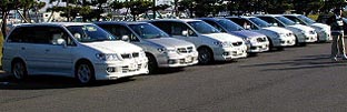 |  | 2日目の松島観光に出発するため、集まった7台。 前日とはグズついた天気とはうって変わって素晴ら しい快晴でした。 |