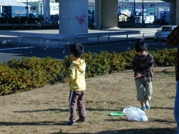 子供たちはシャボン玉遊びに興じてました。 ここに写っているのは小さいシャボン玉ばかり ですが、直径30cmぐらいの大きいものも 作って遊んでました。 |