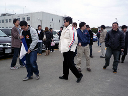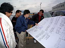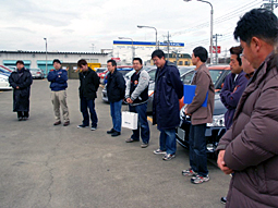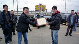 右側茨城メンバーから左側千葉メンバーへ 【大漁旗リレー】完了です。 |