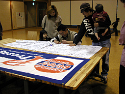 寄せ書きと大漁旗で記念撮影 後列 右から chimo@OBさんご一家、ムツキさん とお子さん 前列 右から すももさん、よしR32U31さん、 Black Chickさん、とどさんです。 撮影時、外は大雨でした |