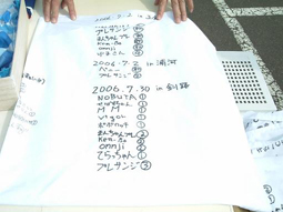 寄せ書きするのは「TEAM PRESAGE」ポロ シャツを着たまんちゃんプレさんです。 |