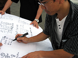 タッケリンコさんです。 皆さん書き込みしました。 これで最終書き込みでした。 道内で14回行われた「寄せ書き」ですが、最高記入 者は13回書き込みをした「あのしと」でした!(爆) 12回の「このしと」と「そのしと」は今回参戦できず、 残念がっていました・・・。 |