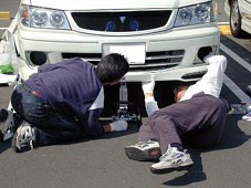 純正のフロント用プロテクターを装着協議中の 下山さんとデイトナさん。 何でも自分で思考錯誤してやってしまう下山さん。 今回も色々と悩みながら装着したり、 装着前の準備段階の型を取ったりしていました。 |