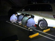 闇夜に浮かび上がる怪しい男4人衆です(核爆) 何とNobuエル号のヘッドライトの照明を頼りに PM8時過ぎの閉店間際までエアロ装着作業を やってたとのこと。その気合と根性に脱帽です。 |