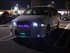 ついに関東にも謎の集団、A○D仕様車が登場!(^^) 写真ではおとなし目に見えますが、実際に見ると 色々な色のネオン管を使っているので結構ハデです。 ちなみにナンバープレートの枠では2人の お姉ちゃんが踊っています(爆) |