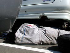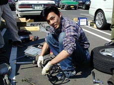のり号のリア足回り交換準備中のNobuさん。 もうすっかりお馴染みの繋ぎを着た姿です。 この日は1日中、プレの下にもぐってました^^;。 |