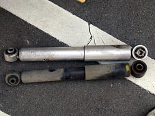 上がインパル、下が純正のリアダンパーです。 比べて見れば一目瞭然!ダンパーの太さ自体が 一回り違います。インパルダンパーに交換してから 結構距離を走っているそうですが、未だに縮めても すぐに元に戻る辺りはさすがにアフターパーツ。 純正は例によって…、これ以上は言わないことに しておきましょう^^;。 |