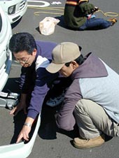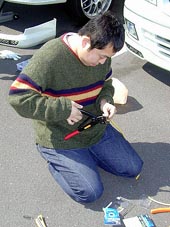 圧着工具を使ってアーシングケーブルを 作成中のよーじさん。 私、ヒューベリオンもお手伝いさせて頂き、 合計6箇所、アース専用線を加工して アースを取りました。 |