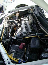 アーシング完成の図です。 目立つ様に黄色のアースケーブルを選んだ為、 結構カラフルでハデなエンジンになりました。 バッテリーに共締めするアース線用の台座も、 見た目にこだわってアース専用の台座を使った為、 収まり具合がかなり綺麗です。 |