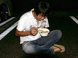 平和島PA名物、激うまラーメン☆○×△□???を ほうばる鎌ちゃんさん。何も食ってない。。。だけど PAのお店は閉まっちゃった。。。ってなわけで、 即興の腹ごしらえです。何故かわからんですが、 ここで集まると必ず誰か一人はこれ食べてます(笑) |