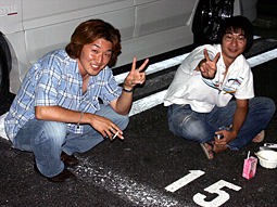 鎌ちゃん号に次の仕込み?を検討中のyoneさんと 鎌ちゃんさん。その後ろでゆうぱぱさんとのりさんは 別談義中です。 |