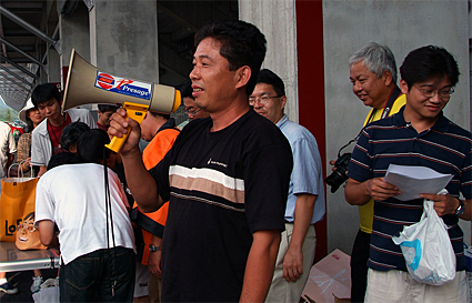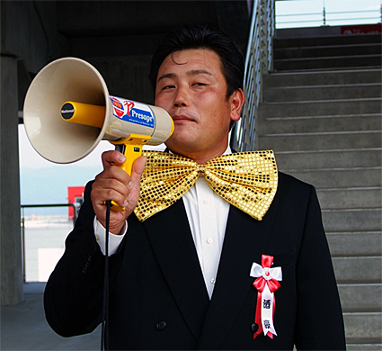 司会のこまざきさんです。 胸には「酒豪」の文字が!! |