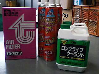 ![]() (1)東洋エアーエレメント 2コ (2)コーザイのパーツ&ブレーキクリーナー 3本 (3)古河薬品工業(株)のロングライフクーラント (オールシーズンタイプ)2L 2コ |