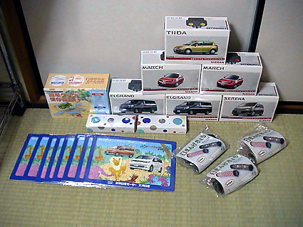 ・ラジコン(マーチ・エルグランド・セレナ・ティーダ)合計 11台 ・ティアナ 置き時計 3個 ・ティアナ ルームシューズ 2個 ・コンパクトジューサー 1個 |