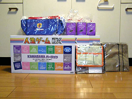 ![]() 人生ゲーム(神奈川バージョン) 3個 レジャーシート付クーラーバッグ 2個 トートバッグ 3個 マガジンラック 1個 紅茶 5個 |