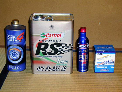 ![]() (1)ブレーキフルード メーカー:エンドレス スペック:DOT−4<ウェット沸点176℃以上> 容 量:1,000ml (2)エンジンオイル<フォーミュラRSライト> メーカー:カストロール スペック:SL 5W−40<100%化学合成> 容 量:4L (3)フューエルワン メーカー:WAKO’S スペック:燃料添加剤(デポジット除去・燃焼効率UP・排ガスクリーン化) 容 量:300ml (4)スポーツMAGオイルフィルター メーカー:SARD スペック:マグネット内蔵オイルフィルター 容 量:− | ヒューベリオンさん |