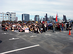 で、こちらがど真ん中を堂々、確保したプレート組み。 怪しい着ぐるみ3人衆ですが何か?(爆) ずうずうしく人の前に割り込んだり、プレートを 出す非常識な人がいるそうで、場所を確保するのに 苦労をしたそうです。 |