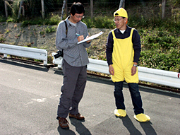 取材を受けるたかまこ@OBさん。 ひよこの着ぐるみのまま取材を受ける姿が 何とも言えないんですが(笑) |