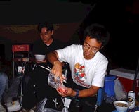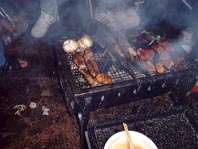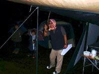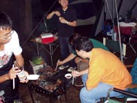 9月15日、曇り時々雨 数日前から台風が猛威をふるっていたので、内心「大丈夫かな〜?」 状態・・・ 朝起きてみましたら、少々雨はパラついているものの、「天気は回復 傾向」という予報 なんとか大丈夫そう 集合予定の西根IC出口PにWA号到着、まだ予定時間(11:30)まで 時間があるので近くのスーパーまでの時間計測をして、再度ICに戻る 予定時刻より一時間ほど遅くなりましたが、当初予定のおやじんさん、 プレ55さん、WAと3台揃ったのでひとまず昼食、(IC出口より役2分の 和風レストランにて、結構安くておいしかったですよ) その後、オフ会会場へ 2時、フリーサイトのチェックイン、いよいよ準備に・・・ おやじんさんのテント設営開始!、ただ、プレ5さん、WA共にキャンプ シロート 見るもの全て、何なのか、どう使うのか、どうするのかさえ分からずオロオ ロ・・・(おやじんさん、ごめんなさい) そして、東北メンバーのキャンプマスター進藤さん登場! さすがはキャンプマスター!手際よく設営が進んでいく(それでも私は わからずオロオロ・・・自爆!) 進藤さんのテント、スクリーンタープ、おやじんさんのタープの設営も終 わりに差し掛かった頃Q45さんも登場! その後キャビン泊組のチェックインをして、いよいよ宴の準備へ・・・ (時刻はすでにPM5:00近く、隣の団体様ご一行はすでに宴会モード、 幹事の準備不足がヒシヒシと表れてきた。 (WA@幹事ちょっとアセる・・・) おやじんさんとプレ55さんが買出し、その間、Q45さん、進藤さんが火 起しを担当・・ WA@幹事は?というと、野菜洗い、お鍋洗い等洗い物をしながら、Sa wadaさん、釣大将さんとの連絡、お出迎えでウロウロ(共に初参加のお 二方になんの目印も連絡していなかった私・・・反省) 無事に釣大将さん、Sawadaさんも合流、いよいよ本格的に準備が進み だします。 PM6:30頃買出し組も帰還、BBQ,とん汁共に全ての材料が揃い、 やっとPM7:00頃今回のオフ会の目的(?)である、BBQがシビレを切 らした」Q45さんの「もう飲んじゃってもいいんじゃない?」の一言から始 まりました。 |