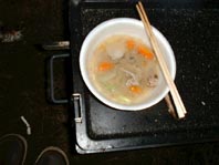 2日目(9月16日) : 曇り 「おはようございま〜っす!」 Q45さんが起こしてくれました、時刻AM8:45分 「ゲゲッ!俺最後まで寝てましたね、す、すいましぇ〜ん」 Q45さん、プレ55さん、Sawadaさんのお三方はもう起きてました 慌てて起きて、二日目開始!! テントの所に行きますと進藤さんご一家はもう起きてます おやじんさん、爆睡中! Q45さんと釣大将さんと3人、進藤さんよりコーヒーを戴く・・美味しいです その時プレ55さん・・・・「辛いっす」状態でそのまま車に行きダウンしてました おやじんさんも一旦起きてくるものの、再度沈没・・ツラそうです 昨夜の残りのとん汁と進藤さんが炊いてくれたご飯で朝食 とん汁の味がしみててウマイウマイ!! |