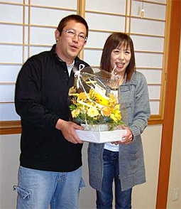 花束を受け取って嬉しそうなお二人さんです 花のアレンジは坊幹事のセンスとか(笑) |