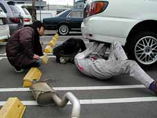 マフラー取り付け作業 またこれです!プレ&バサの下を覗いたり潜り込むのが 大好きな神奈川メンバー。オフ会のたびに必ずこの光景が 見られるような気が^^;。繋ぎを着てマフラー交換中のNobu &Akikaさん(OB)とのりさん、作業を見ているオーナーの GOバサ@シンさん。 プレ用のブラストマフラーをインパルに装着不能と言われた バサラに付けているところですが、ブッシュを変えれば何ら 問題無く装着可能なことが判明! 「簡単に付くじゃねーか!インパルのウソツキ!!」 |