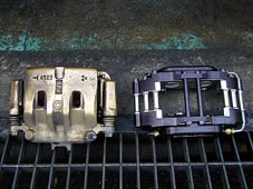 右がアウトローのアルミ製4ポットビッグキャリパー、 左が純正です。右のアウトロービッグキャリパーの重さは 3kgあるかどうか程度しかありません。 これでも重い方だというのですから驚きです。 対照的に純正は「鉄アレイか?これは!?」というぐらい 重たく<6kg>、冗談抜きに片手でヒョイと持てるような レベルではなく、両手でよいしょ!という重量でした。 |