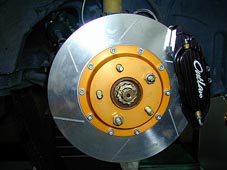 取付けられたブレーキ本体の完成図です。 この姿になるまでが大変で、まずローターが厚くて オフセットが変わってしまい、ハブボルトを5mmほど延長。 一番困難だったのがキャリパーで、キットのブラケットでは ボルトの径が違う・穴の位置が違う・厚さが足りない等で 付けられず、社長がブレーキを前に2時間以上悩んでました。 最後にこれでダメならブラケットを作るということで、 ダメ元で社長が考え出した案が大成功!! 社長が自ら久々に悩んだというブレーキの完成です。 |