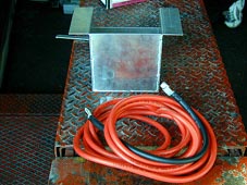 移設の為、ワンオフ作成した電池ボックスと 延長ケーブルです。この他アーシングの 延長ケーブルがあります。ケーブルは黒が<+>、 赤が<−>用です。 |
