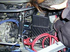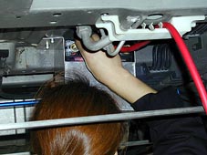 床下から引込んだ延長ケーブルの配線作業です。 元々バッテリーが取付けられていた配線に、 この延長ケーブルをボルトで共締めし、 バッテリーまで延長させます。 |