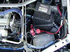 後ろ方向から前に向かっての配線状態です。 プラス側の線はすぐ後ろに取付けられた センターロアームバーと共締め。 マイナス側とアーシング用の延長コードを ボンネット内に引きこんでいます。 |