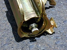 上と同じく、リアダンパーの調整部拡大写真です。 調整部はダンパー上部の根元部分(黒い所)です。 フロントダンパーと同じく、時計回り(右方向)へ回すと固くなり、 逆に回せばソフトになります。 このリアダンパーの減衰力調整方式は、オーリンズがつい最近、 初めて開発に成功したもので、特許申請中だそうです。 |