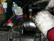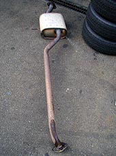 取り外した純正センターパイプです。 消音の為に大きく取られたサブタイコに加え、あまり深 い意味はなさそうな曲げが何箇所もある為、排気効率 に関してはお義理にも良いとは言えません。 |