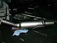 取付け用の掛台(もちろんチタン製!)の仮溶接も終わって あとは取付け待ち状態のテールエンド。 形状も砲弾型で迫力十分です。 この後、出口付近をあのチタンの怪しげな焼き色に仕上げて もらいました。 |