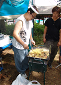 一番最初に、焼き鳥を焼きました♪ニンニクが間に入った焼き鳥のお味はどうだったでしょうか!? こまざきさん・たにどんさんが焼き鳥焼いてくれましたよ♪ |