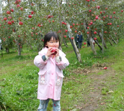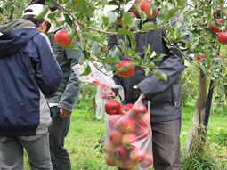 大量にリンゴを狩っているのはプレサンジさん 4〜5個で250円位のはずなのでいったい・・・ この後ブドウも狩っていました (まんちゃんプレさん提供) |