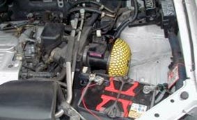 miu号にキノコを取付中のJerryさん。 手際が良くエアクリ解体から30分で取付完 了です。 |