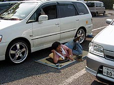 カモドゥーにて エスクのボンネットを開け「さぁ〜てやろうか!」とあきらさん 道具持ち出し何をやるのかなぁ? |