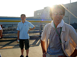 1Fの涼しいところで本日の作業を終えたチュンバ号を 前に談議中のこいちさんとチュンバさん。 |
